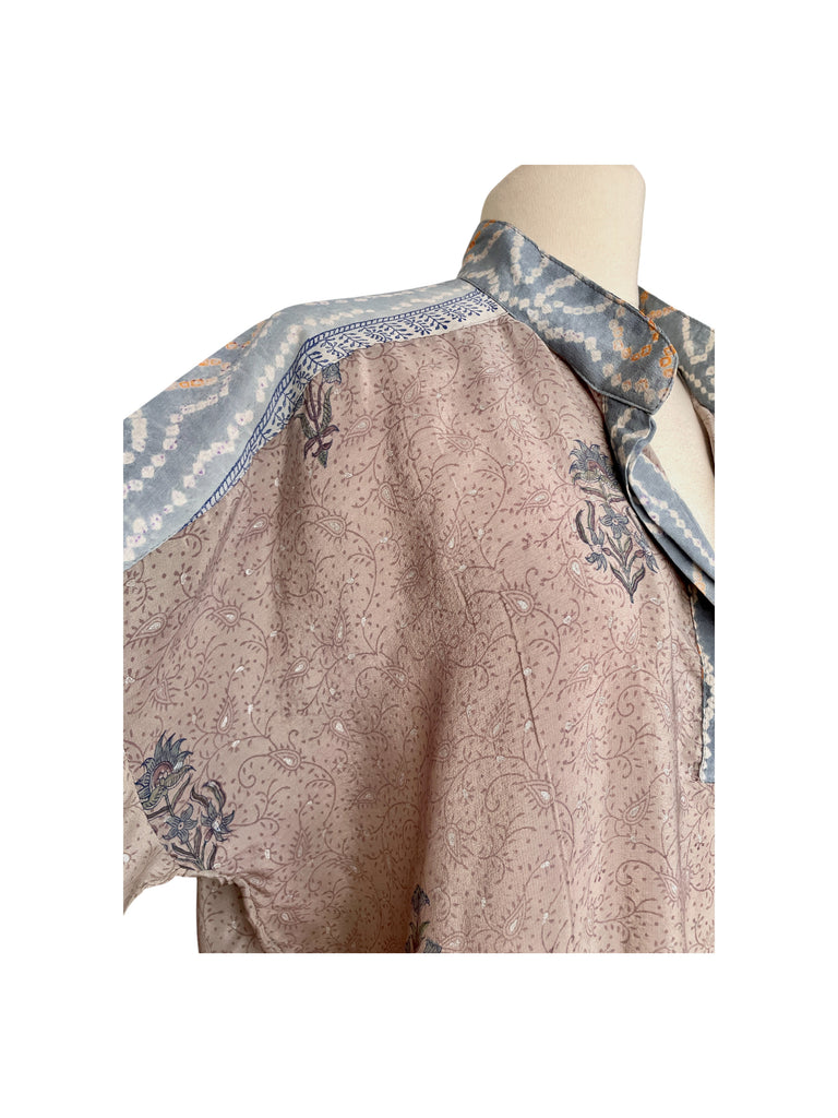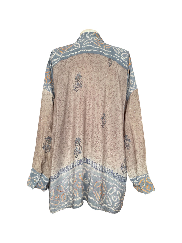 It has a Mao collar, under-placket tightening, side slits, plus a long one in the back.