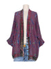 It's generous with 3/4 batwing sleeves hemmed with a lapel. It is collarless, and the neckline is held in place by a single button so that the two sides can be crossed.