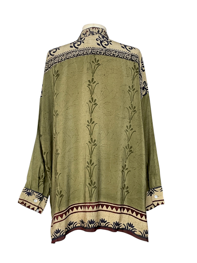 It has a Mao collar, under-placket tightening, side slits, plus a long one in the back.