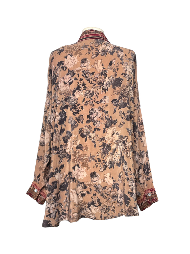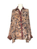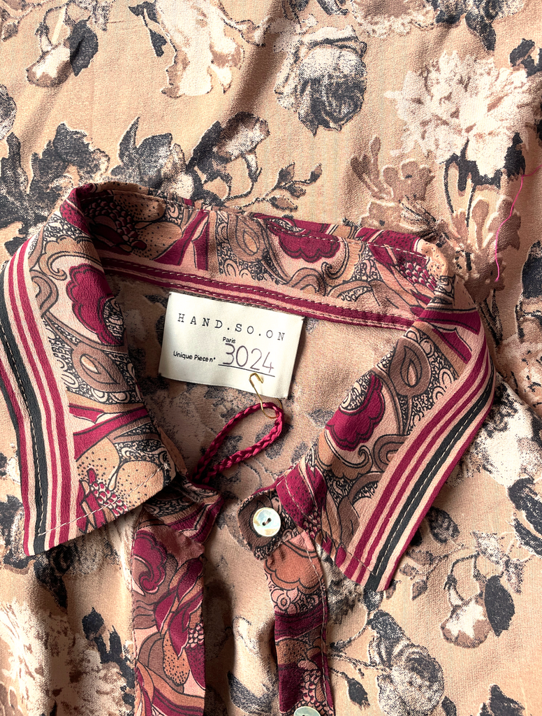 Unique numbered model (only one Gisèle in this pattern), one size fits all, 36 to 42. Front height 72 cm, back 75 cm. Chest circumference 160 cm, hip width 95 cm, arm circumference 36 cm, collar/wrist length 80 cm, hip width 95 cm.