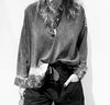 It has an oversized trapeze shape, batwing sleeves, tightened under the tabs, and the bottom of the shirt is shaped like a liquette.
