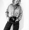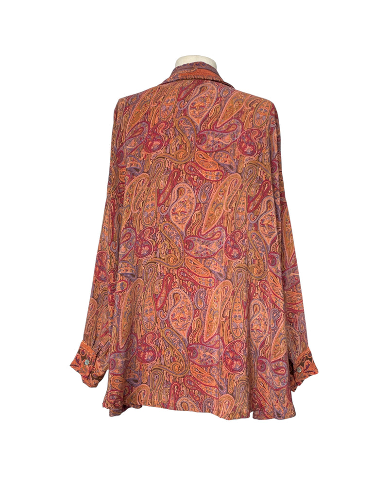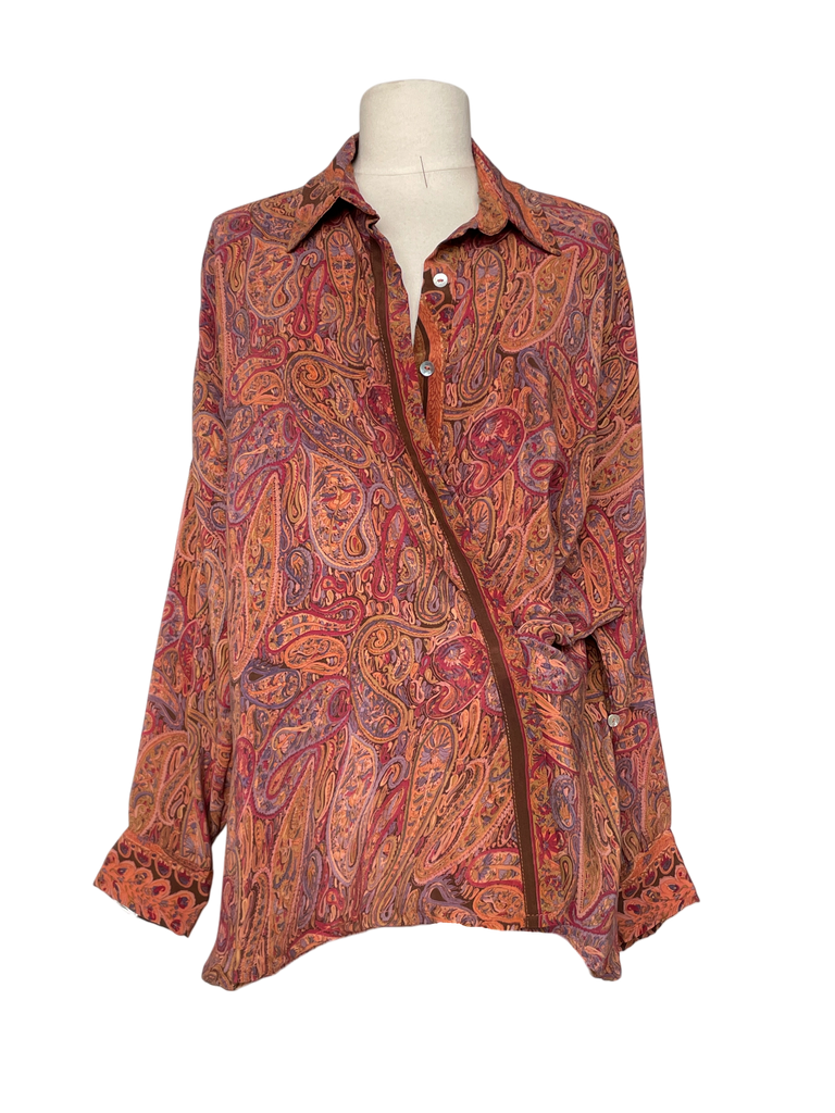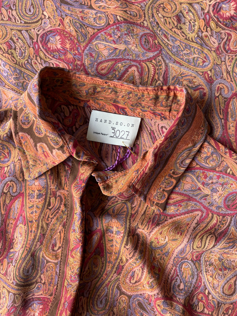 Unique numbered model (only one Gisèle in this pattern), one size fits all, 36 to 42. Front height 72 cm, back 75 cm. Chest circumference 160 cm, hip width 95 cm, arm circumference 36 cm, collar/wrist length 80 cm, hip width 95 cm.