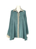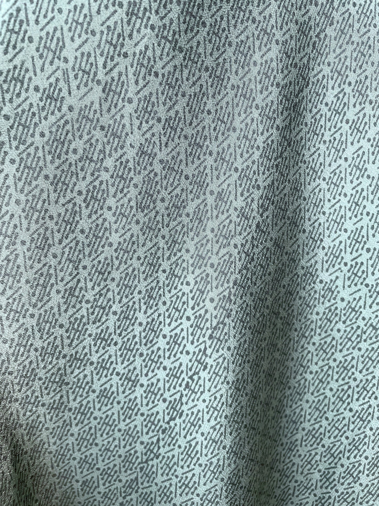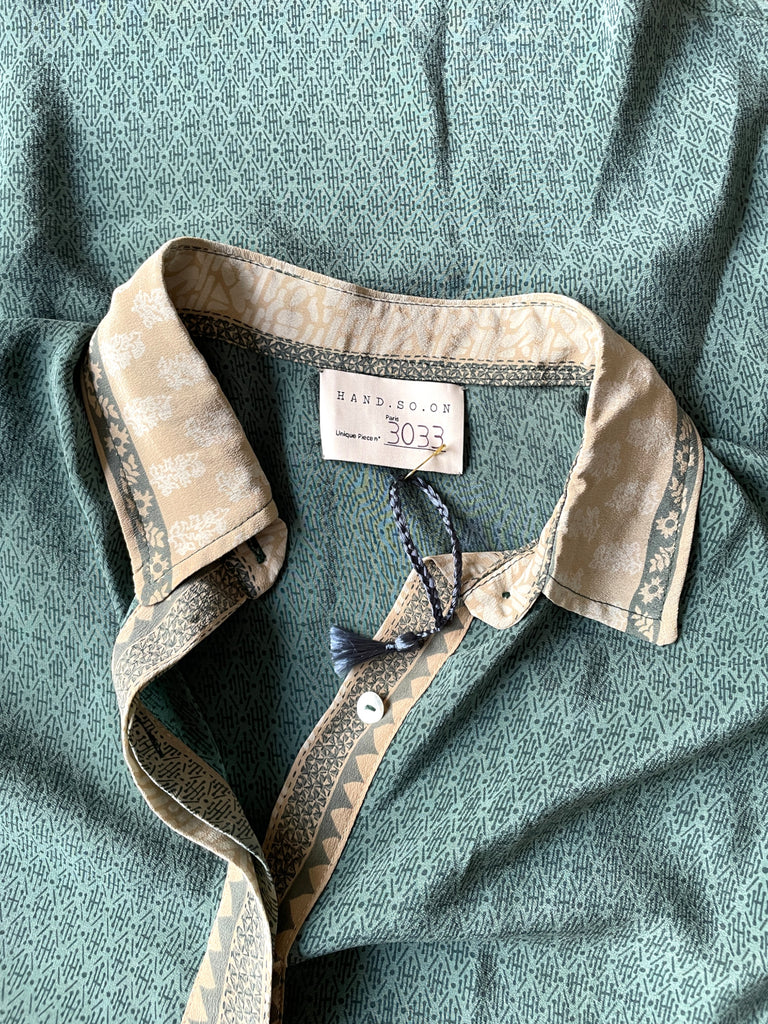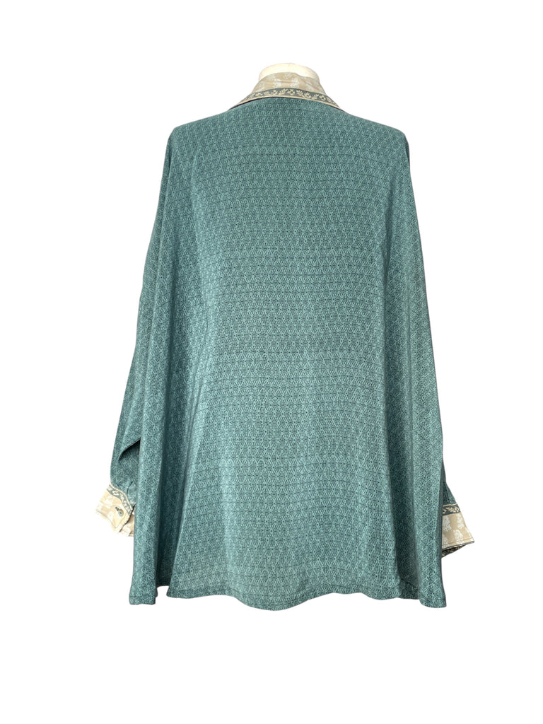 Unique numbered model (only one Gisèle in this pattern), one size fits all, 36 to 42. Front height 72 cm, back 75 cm. Chest circumference 160 cm, hip width 95 cm, arm circumference 36 cm, collar/wrist length 80 cm, hip width 95 cm.