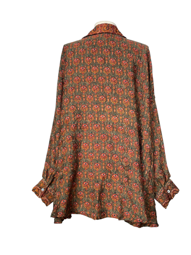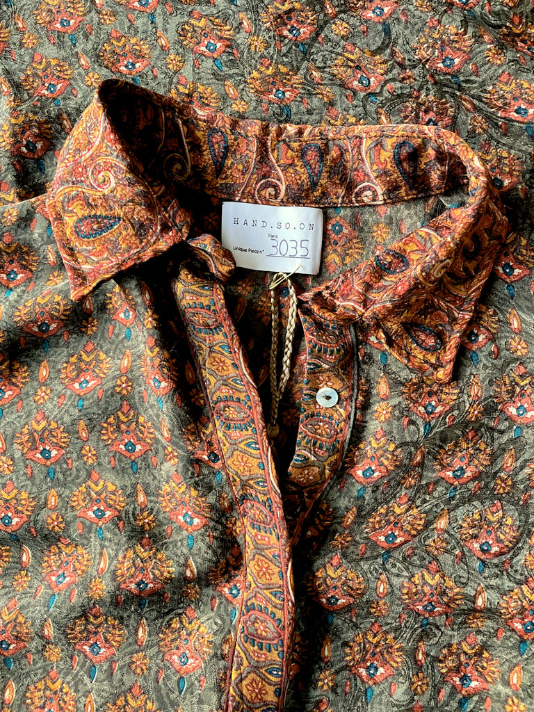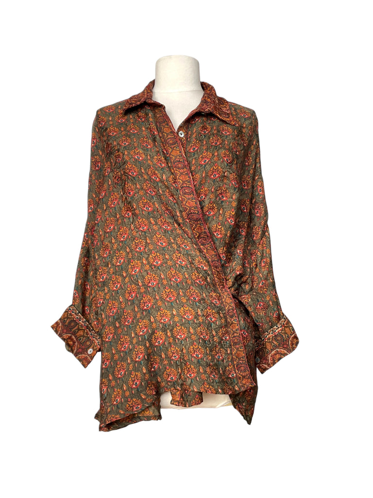 Unique numbered model (only one Gisèle in this pattern), one size fits all, 36 to 42. Front height 72 cm, back 75 cm. Chest circumference 160 cm, hip width 95 cm, arm circumference 36 cm, collar/wrist length 80 cm, hip width 95 cm.
