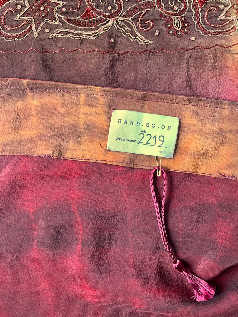 Unique numbered model (only one Janine in this pattern), created by hand and the eye of the designer who positioned the pattern by optimizing the design of the traditional sari.
