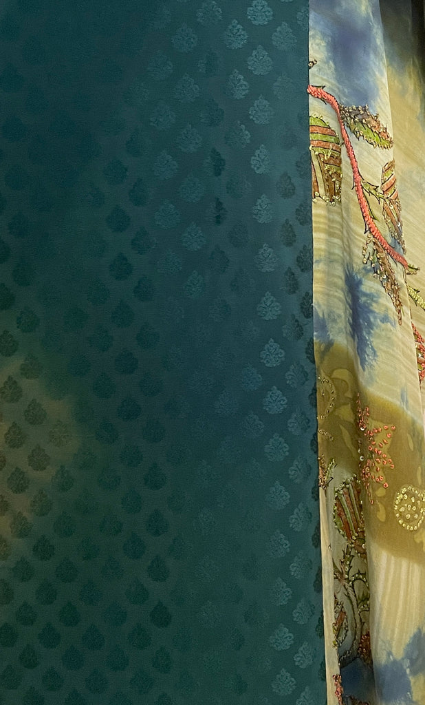 Unique numbered model (only one Janine in this pattern), created by hand and the eye of the designer who positioned the pattern by optimizing the design of the traditional sari.