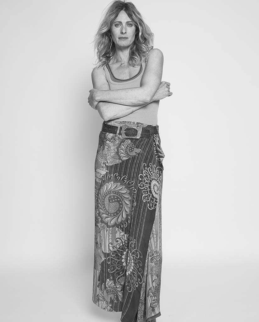 It is a long skirt, wrapped around the hips and folded in front in a drape with an undulating flap positioned on the hip in a contrasting fabric and is adjustable at the waist with an invisible buttoning. It has loops to accommodate a 4 cm wide belt that asserts its fashionable look.