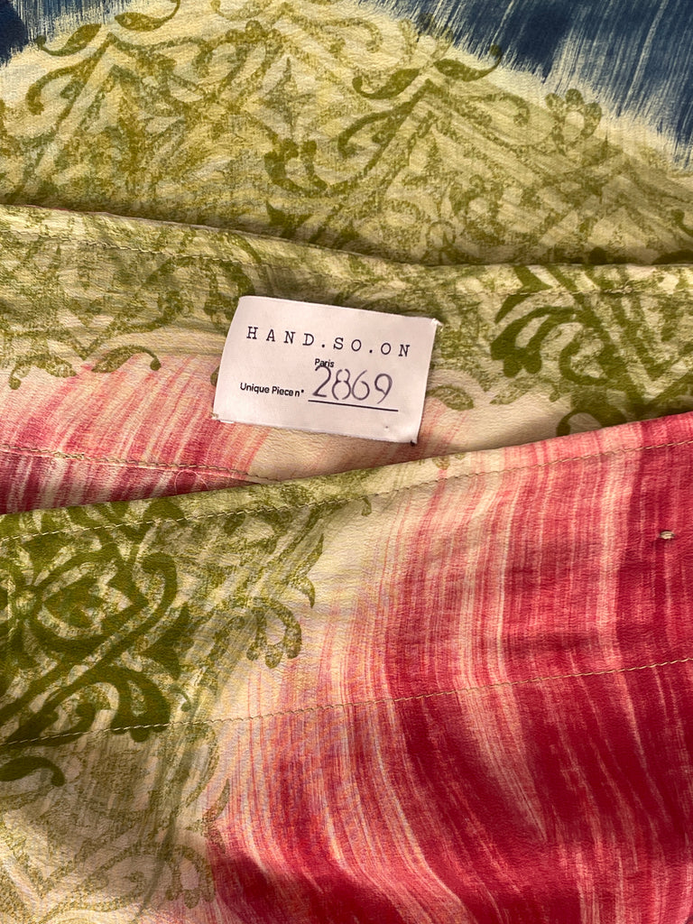 Unique numbered model (only one Janine in this pattern), created by hand and the eye of the designer who positioned the pattern by optimizing the design of the traditional sari.