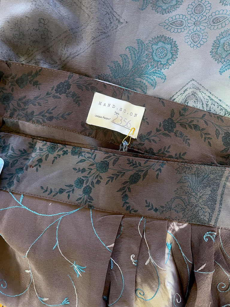 It is a knee-length skirt with a wrap-around shape, draped around the hips with a "mermaid" effect, due to the curve of its cut and adjustable at the waist with a set of buttons. It is sold with a scarf belt with contrasting patterns that enhance the preciousness of the original designs. We advise you to wear this ribbon by positioning it asymmetrically to let it float around the legs.