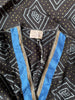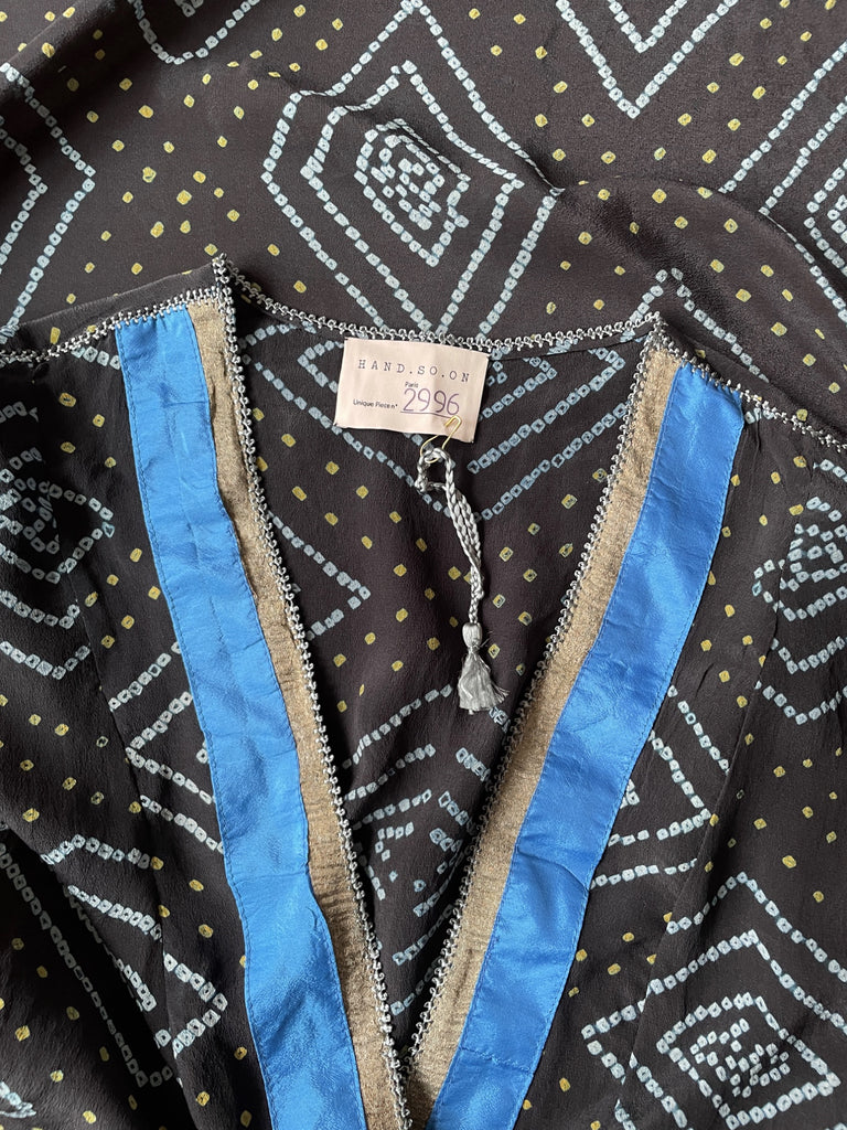The long kimono can be worn open as a long vest or as a long wrap-around dress thanks to a system of ties. The kimono is hand-finished with vegetable silk thread, a ladder stitch on the shoulders and a traditional Moroccan croquet stitch called DERS on the edges.