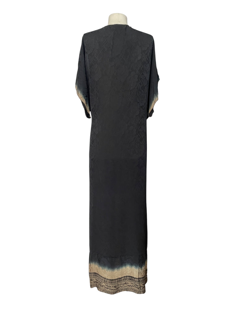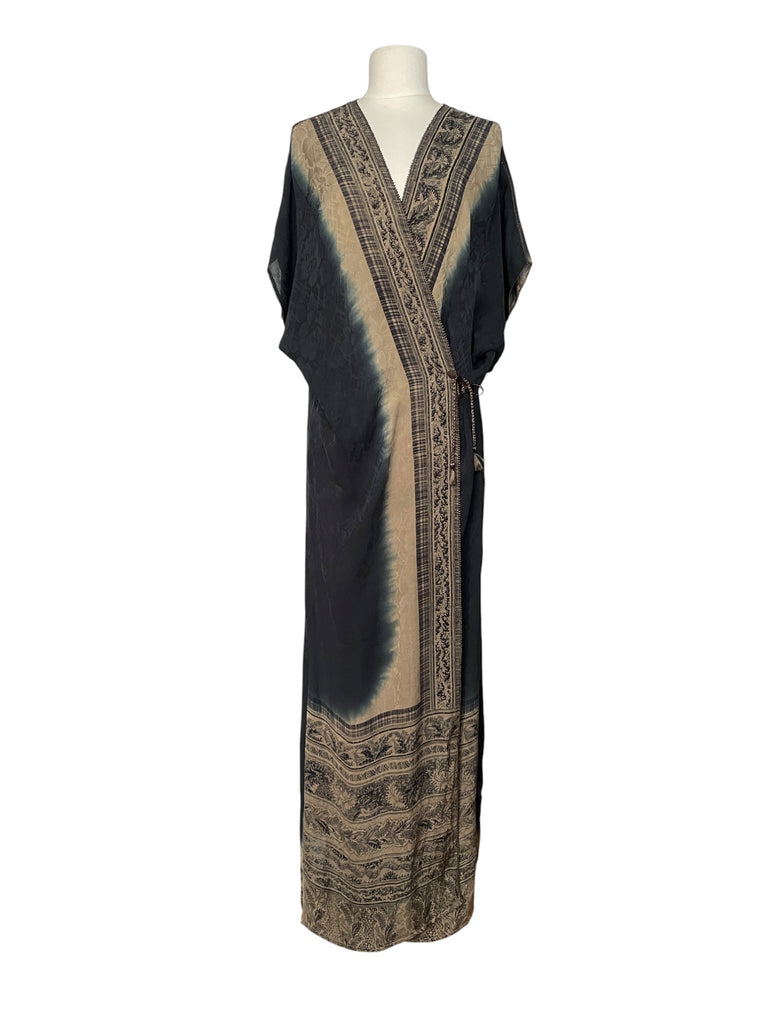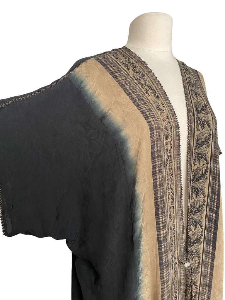 Unique numbered model, (only one long kimono in this pattern), one size fits 36 to 42. Length 150 cm, sleeve length 33 cm. Model measures 1.73 cm.