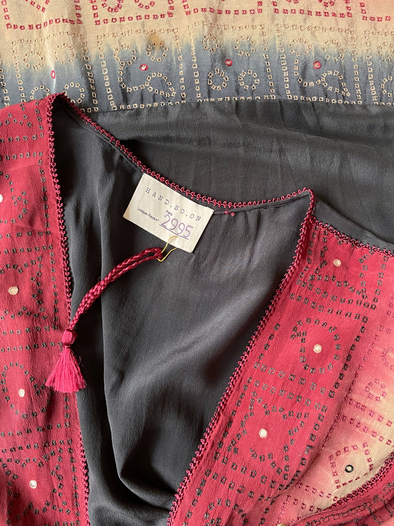 This model is made from an embroidered vintage silk crepe sari.