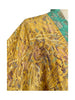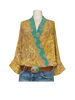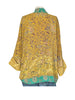 It's generous with 3/4 batwing sleeves hemmed with a lapel. It is collarless, and the neckline is held in place by a single button so that the two sides can be crossed.