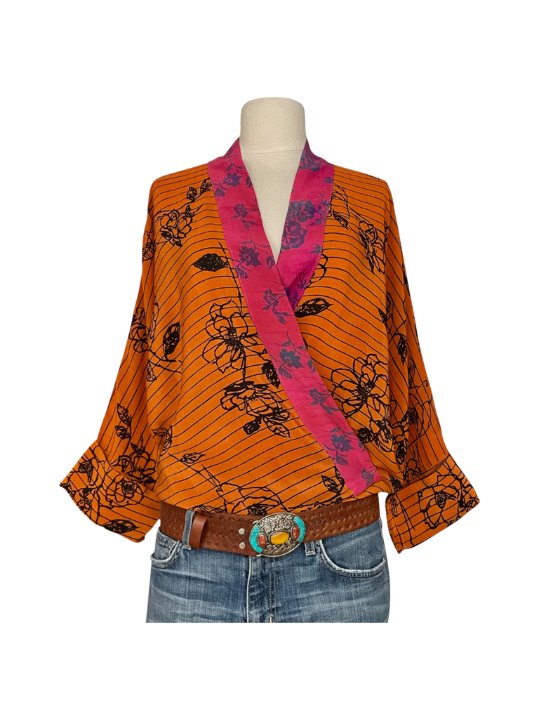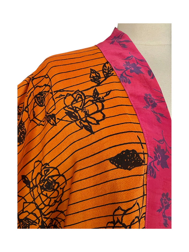 It's generous with 3/4 batwing sleeves hemmed with a lapel. It is collarless, and the neckline is held in place by a single button so that the two sides can be crossed.