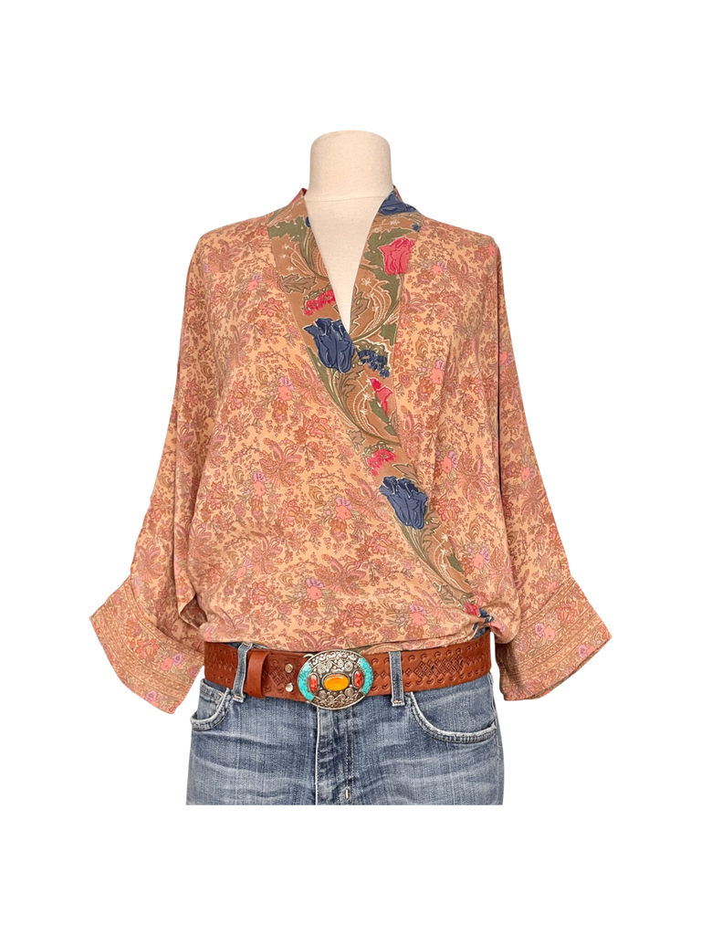 It's generous with 3/4 batwing sleeves hemmed with a lapel. It is collarless, and the neckline is held in place by a single button so that the two sides can be crossed.