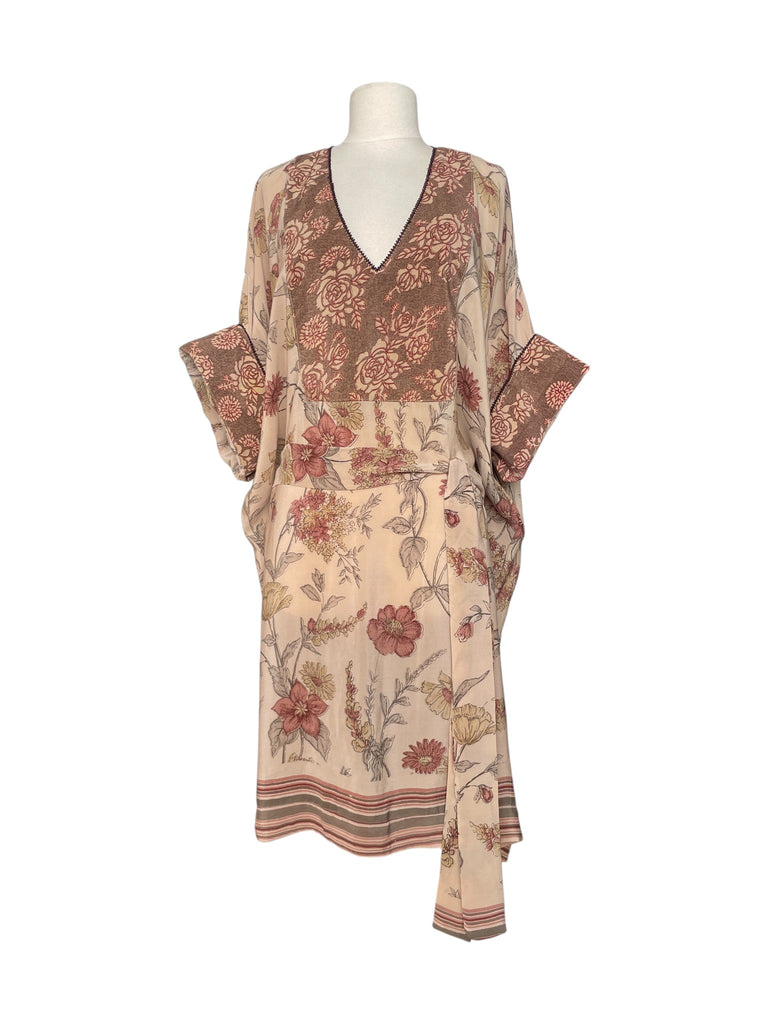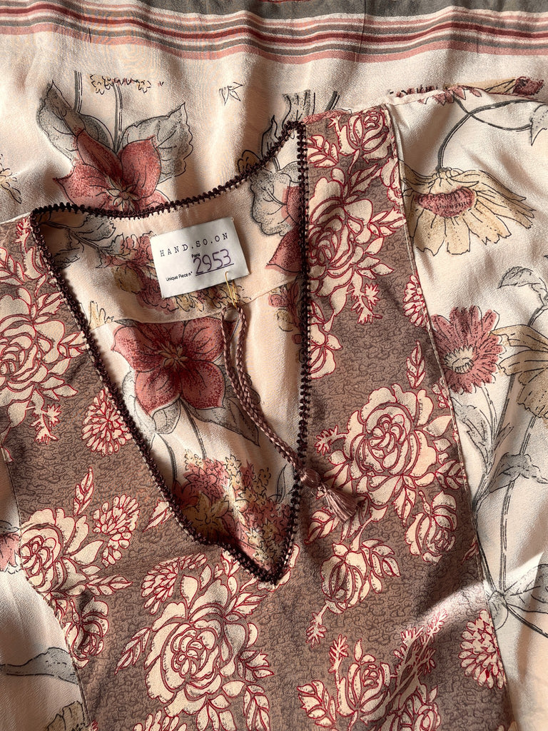 This shape is magic, it fits all sizes and the shape The generous size of the fabric allows the vintage silk to undulate around the body.