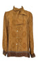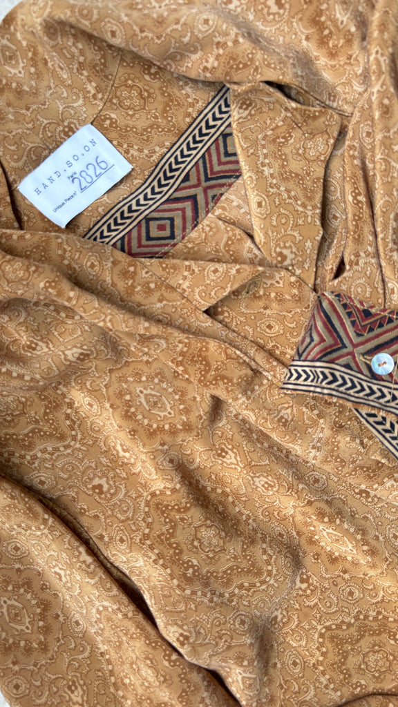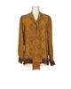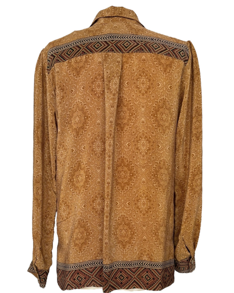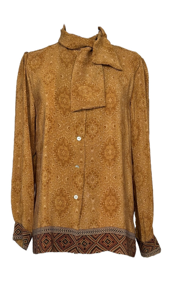 It has a straight shape, slightly flared at the hips, with puffed sleeves thanks to pleats on the shoulders. The collar is composed of a long scarf that wraps around the collar in a shawl lapel and ties at chest height, buttoning under the tabs, the bottom of the shirt is straight with side slits.