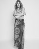 C'est une jupe longue, enroulée autour des hanches et repliée devant en drapé avec un pan ondulant positionné sur la hanche dans un tissu contrasté et est réglable à la taille grâce à un serrage invisible. Elle possède des passants pour accueillir une ceinture de 4 cm de large qui affirme son allure mode.