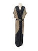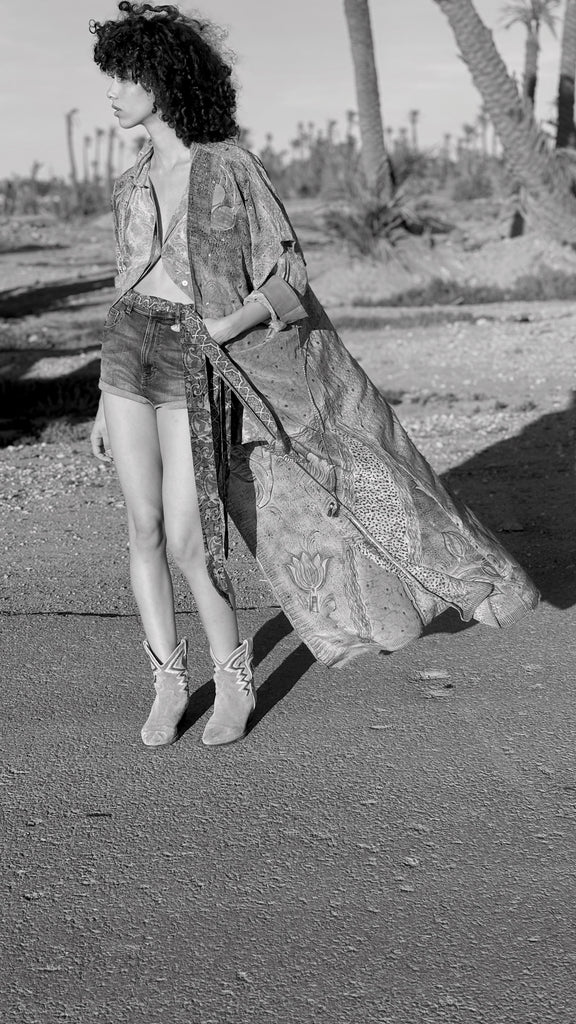 Le kimono long peut être porté en version ouverte en gilet long ou en robe longue croisée cache-cœur grâce à un système de liens. Les finitions sont réalisées à la main avec un fil de soie végétale, sur les épaules d'un point échelle et en bordure du kimono d'un point croquet traditionnel marocain appelé DERS.