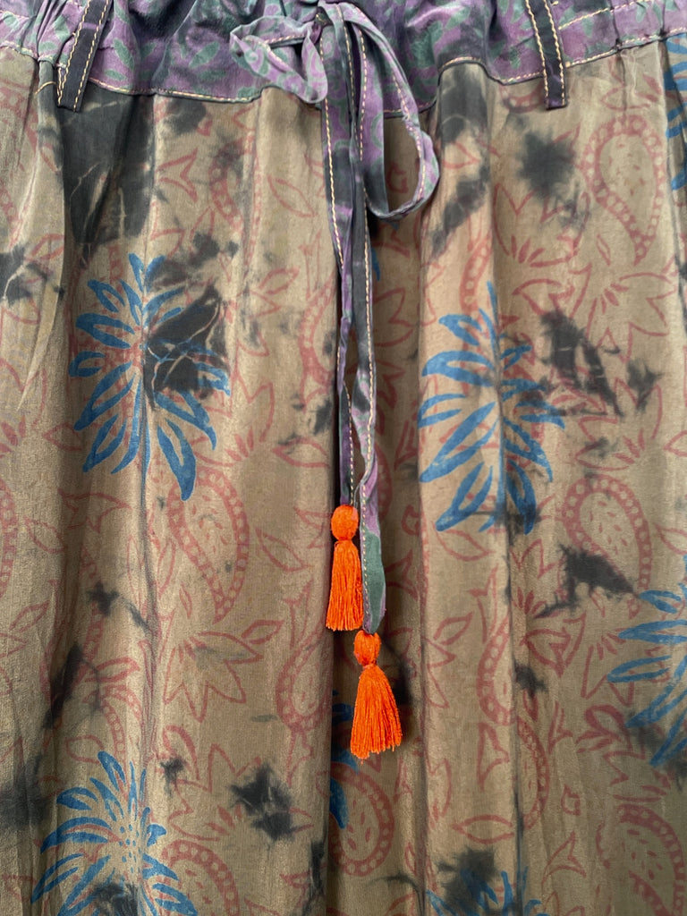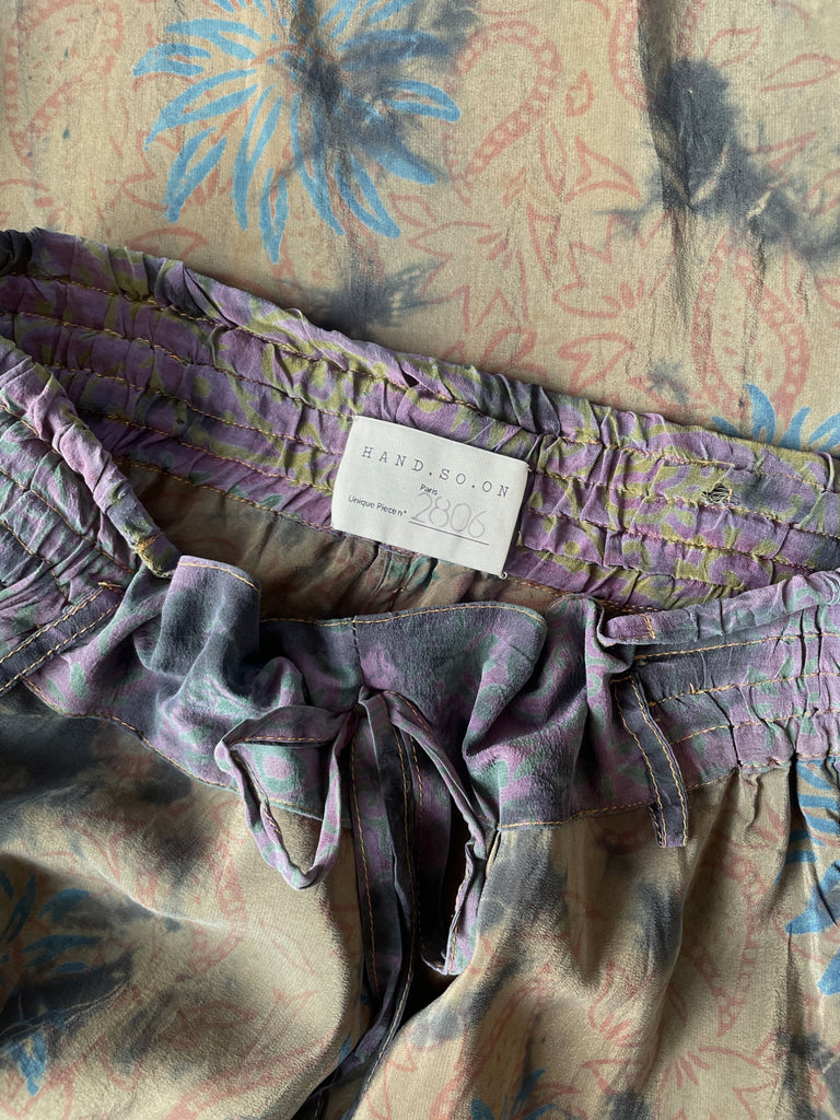 PATRICK est réalisé à partir d’un sari ancien. C’est un pantalon taille haute aux jambes larges.