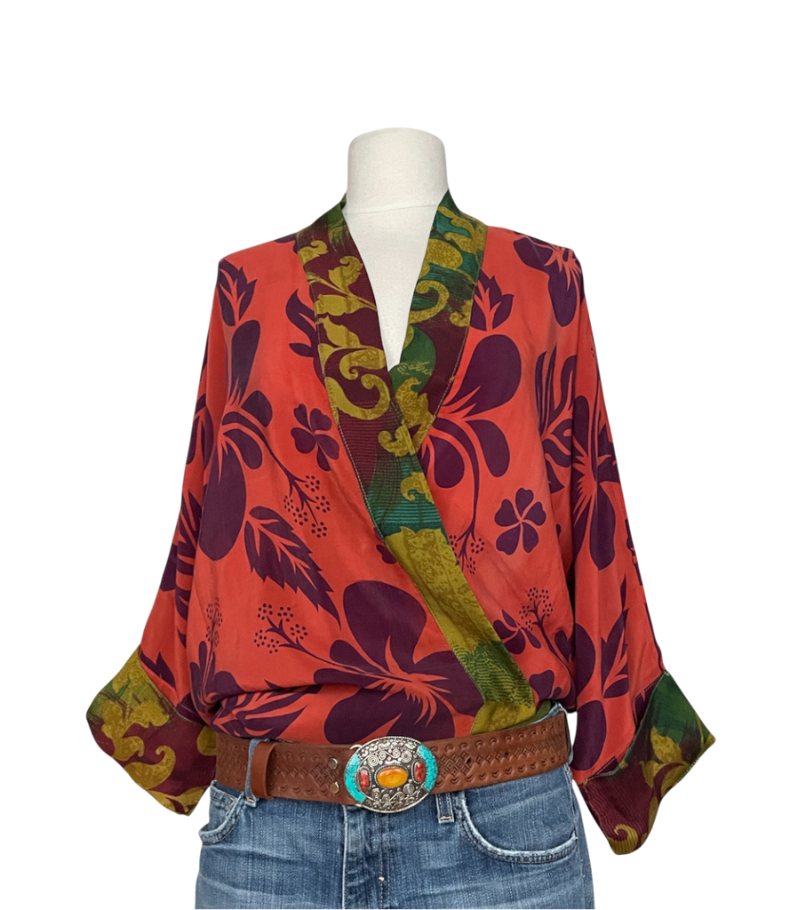 Elle est réalisée à la main à partir d’un sari en crêpe de soie vintage brodée.