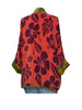 Elle est généreuse avec des manches chauve-souris 3/4 ourlées d’un revers. Elle est sans col et son décolleté est retenu par un seul bouton afin de pouvoir croiser les deux pans pour