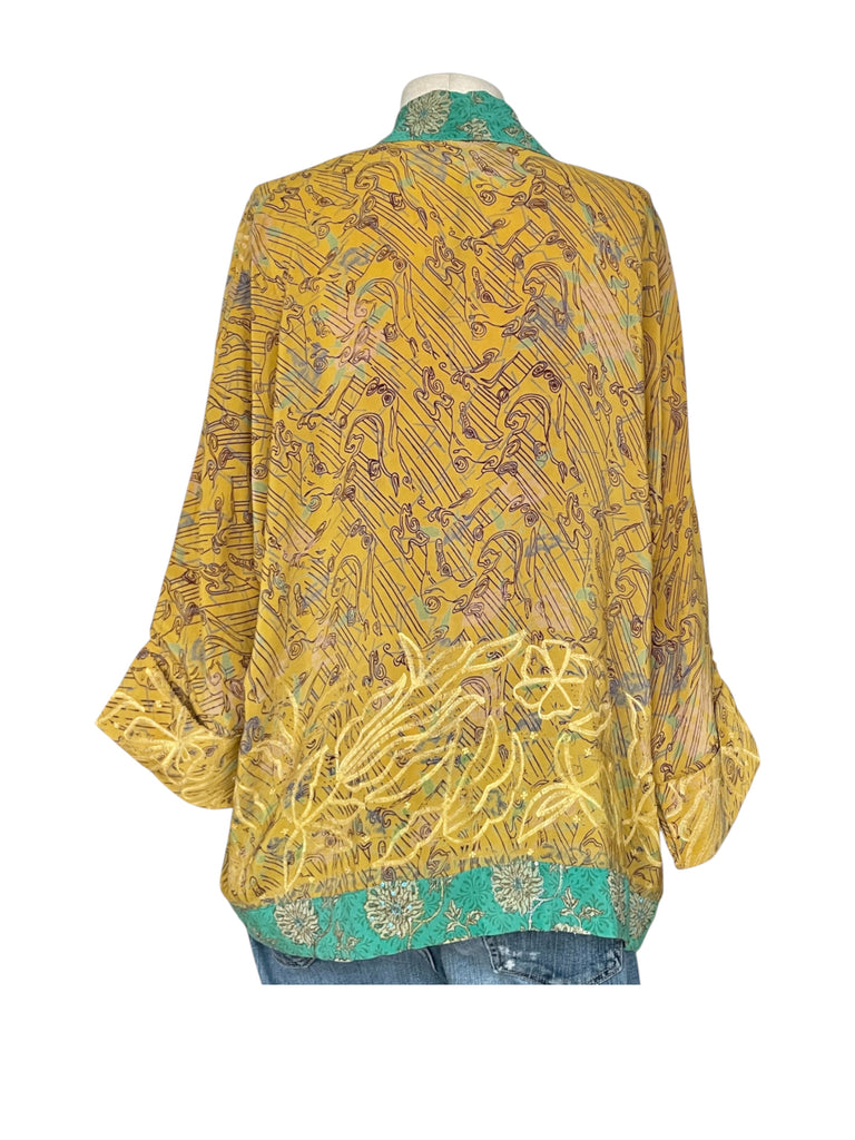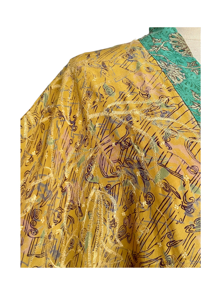 Elle est réalisée à la main à partir d’un sari en crêpe de soie vintage brodée.