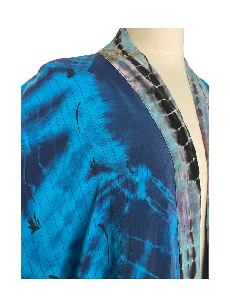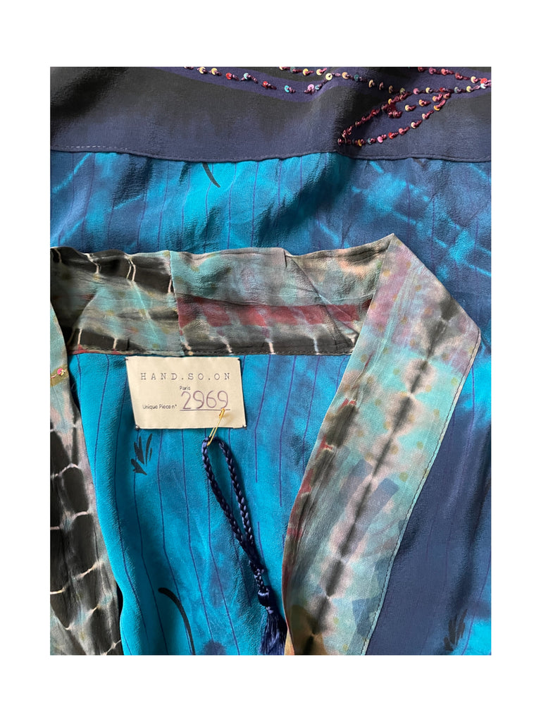 Elle est réalisée à la main à partir d’un sari en crêpe de soie vintage brodée.