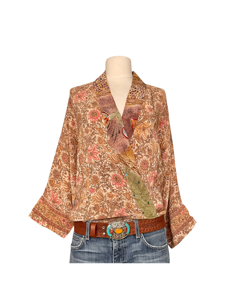 Elle est réalisée à la main à partir d’un sari en crêpe de soie vintage brodée.