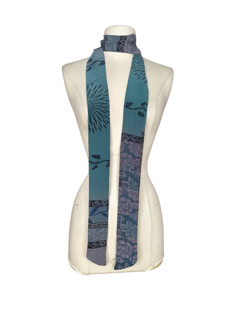 Cette écharpe, cravate, tour de cou, bandeau est réalisée à partir d’un sari ancien en crêpe de soie vintage. Chaque modèle est unique.