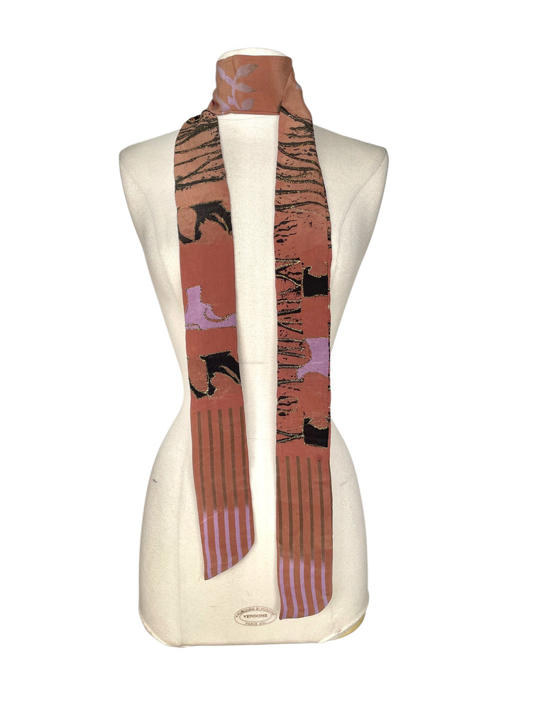 Cette écharpe, cravate, tour de cou, bandeau est réalisée à partir d’un sari ancien en crêpe de soie vintage. Chaque modèle est unique.